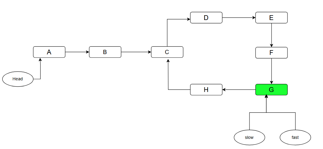 Now, that we have figured out that there is a cycle present in the linked list, for the next step we need to find out the starting point of cycle, i.e., C.