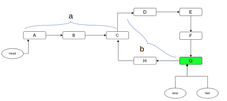 - $b$ is the distance between C and G, i.e., distance between the starting point of cycle and meeting point of both pointers.